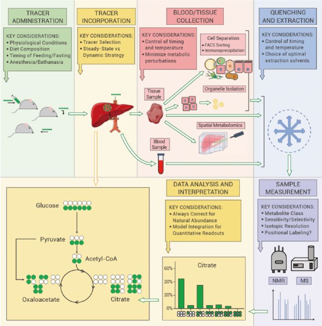 如何篩選穩(wěn)定同位素示蹤劑來進行體內(nèi)代謝實驗?zāi)兀縅uan Fernández-Garcí 教授等人對用不同穩(wěn)定同位素做體內(nèi)示蹤實驗的文獻做了匯總,并總結(jié)了體內(nèi)示蹤實驗總流程圖,具體的過程如下: