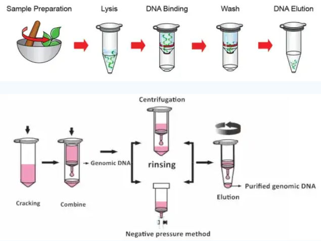 通過特殊硅基質吸附材料,能夠特定吸附DNA,而RNA和蛋白質順利通過,然后利用高鹽低PH結合核酸,低鹽高PH值洗脫,來分離純化核酸。離心柱純化也是試劑盒提取中廣泛的使用方法。