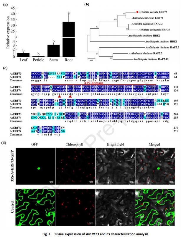 作者在A. valvata KR5中鑒定出一個(gè)受洪澇誘導(dǎo)的ERF-VII基因,命名為AvERF73。隨后,作者檢測了AvERF73在不同組織中的表達(dá)情況,發(fā)現(xiàn)其在根系中的含量最高。系統(tǒng)發(fā)育樹分析顯示,AvERF73與AcERF74的蛋白序列最接近。蛋白序列分析顯示,AvERF73含有一個(gè)AP2保守結(jié)構(gòu)域,這個(gè)結(jié)構(gòu)域含有Ala14和Asp19保守位點(diǎn),說明AvERF73屬于ERF轉(zhuǎn)錄家族。之后作者將AvERF73與GFP融合表達(dá),并在細(xì)胞核中檢測到GFP熒光,證明AvERF73定位于細(xì)胞核中。