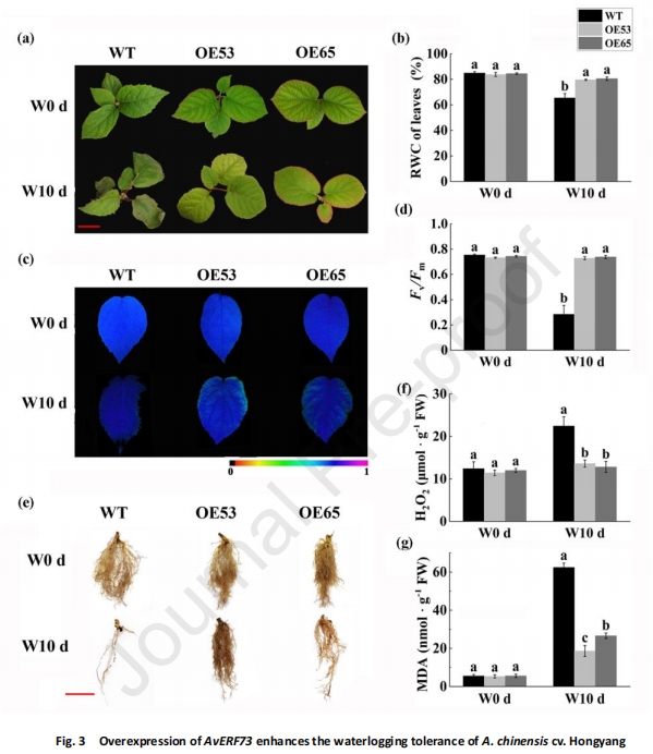 為研究AvERF73基因的功能,作者在擬南芥中過表達(dá)AvERF73基因,進(jìn)行澇脅迫,發(fā)現(xiàn)過表達(dá)植株比WT植株更耐澇害,證實(shí)了AvERF73的過表達(dá)增強(qiáng)了擬南芥的耐澇害能力。
