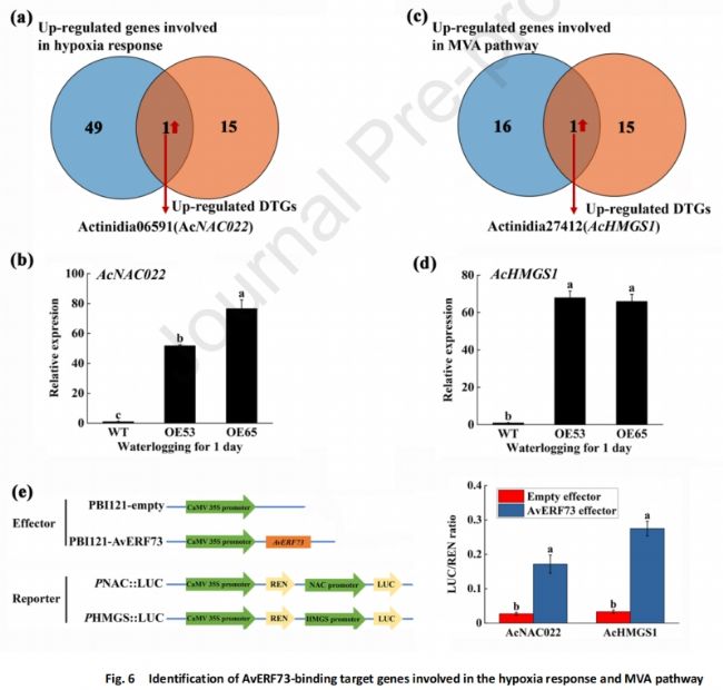 為了進(jìn)一步揭示AvERF73的潛在DTG。Venn圖分析發(fā)現(xiàn),在"cellular response to hypoxia"和MVA途徑中,AcNAC022和AcHMGS1基因?yàn)锳vERF73的潛在DTGs。Dual-Luc實(shí)驗(yàn)發(fā)現(xiàn)AcNAC022和AcHMGS1與AvERF73蛋白呈正相關(guān)關(guān)系。據(jù)此推測,AvERF73調(diào)控了AcNAC022和AcHMGS1的表達(dá)。