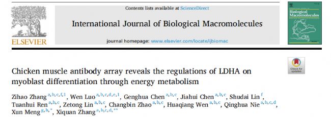 文章題目為“Chicken muscle antibody array reveals the regulations of LDHA on myoblast differentiation through energy metabolism”于2023年10月發表在International Journal of Biological Macromolecules雜志,作者來自于廣東省農用動物基因組學與分子育種重點實驗室和農業部雞遺傳育種與繁殖重點實驗室。