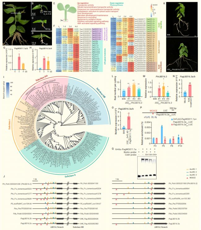 隨后作者重點(diǎn)研究了LBD16在楊樹不定根再生中的作用,對(duì)LBD基因進(jìn)行系統(tǒng)發(fā)育分析,結(jié)果顯示在楊柳屬中存在兩個(gè)AtLBD16同源基因分支,即LBD16.2分支和LBD16.3分支,均位于IIIA亞類。雜交84K楊基因組包含4個(gè)LBD16基因,毛果楊(Populus trichocarpa)基因組包含兩個(gè)LBD16基因,過表達(dá)PtrLBD16.3 (35Spro:PtrLBD16.3)顯著增強(qiáng)了84K楊的不定根再生,這表明LBD16蛋白在促進(jìn)不定根再生過程中可能具有進(jìn)化保守性。