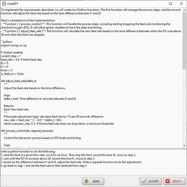 (2)根據(jù)提示向AI描述想要實(shí)現(xiàn)的生物工藝控制需求,包括輸入輸出參數(shù)、控制邏輯等。注意盡量用清晰、簡(jiǎn)潔的語(yǔ)言,并且包含盡可能多的細(xì)節(jié),這樣有助于AI生成準(zhǔn)確的UDF代碼。