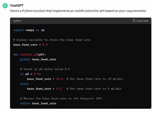根據(jù)我們的測(cè)試,ChatGPT在處理簡(jiǎn)單的邏輯時(shí)正確率非常高,例如針對(duì)pH值,基于開關(guān)控制的方式控制堿液補(bǔ)加,從而維持pH值在6.5:
