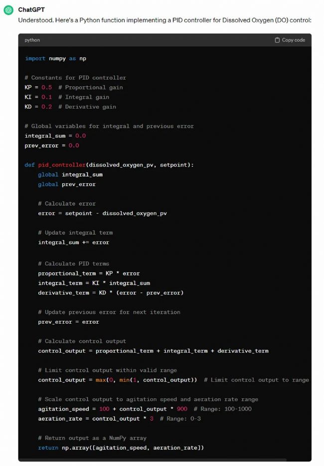 盡管我們的反應(yīng)器已經(jīng)為大部分參數(shù)預(yù)設(shè)了PID控制器,但是如果您想自定義PID算法,AI也幫助生成代碼,滿足定制化需求。
