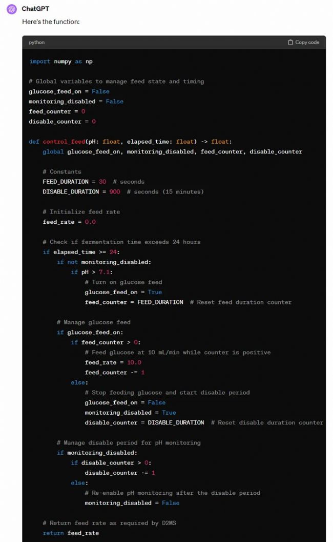“Obtain the pH and elapsed fermentation time (in hours) from the function arguments, and returns feed rate. After 24 hours of fermentation, keep monitoring the pH value. If the pH rises above 7.1, feed glucose at a rate of 10 mL/min for 30 seconds. After 30 seconds, turn off the glucose feed and disable pH monitoring for 15 minutes. After 15 minutes, repeat the previous steps.”