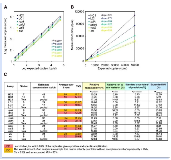 (C)Vibrio-Sequins標準品的dPCR方法驗證的相關結果。顯示的數據是三次dPCR實驗總體平均拷貝數濃度(cp/μL)和總體CV值(%),重復性(%),批間重復性(%),標準不確定度(%),以及k=2的MU不確定度。