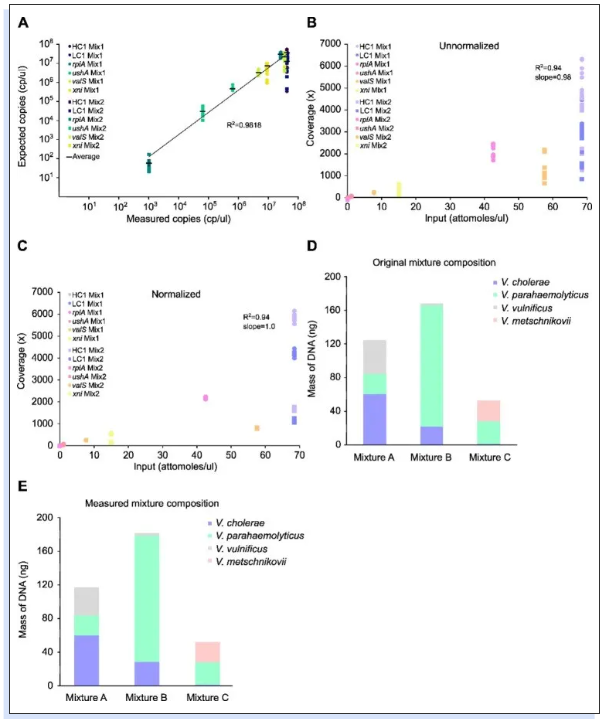 (D) 三種不同的弧菌DNA混合物(A、B 和 C)由 Qubit 定量,包括來自霍亂弧菌、副溶血性弧菌、創傷弧菌和梅茨尼科維弧菌的不同量的DNA,并以 2%的豐度加入Vibrio-Sequins混合物 1(混入 A 和 B)或Vibrio-Sequins混合物 2(混入C)。