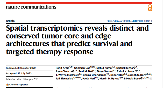 Arora R, Cao C, Kumar M, Sinha S, Chanda A, McNeil R, Samuel D, Arora RK, Matthews TW, Chandarana S, Hart R, Dort JC, Biernaskie J, Neri P, Hyrcza MD, Bose P. Spatial transcriptomics reveals distinct and conserved tumor core and edge architectures that predict survival and targeted therapy response. Nat Commun. 2023 Aug 18;14(1):5029. doi: 10.1038/s41467-023-40271-4IF: 16.6 Q1 . PMID: 37596273; PMCID: PMC10439131.