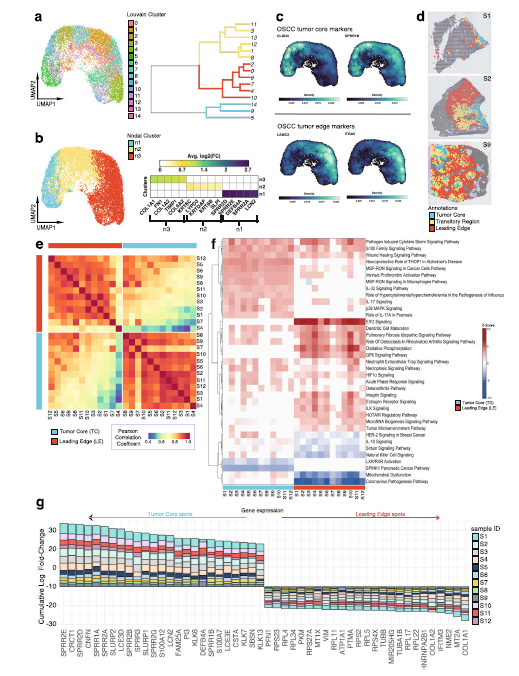 腫瘤微環(huán)境的空間組織對生物學(xué)和治療反應(yīng)有著深遠的影響。對hpv陰性口腔鱗狀細胞癌(OSCC)進行了單細胞和空間轉(zhuǎn)錄組學(xué)分析,以全面表征腫瘤核心(TC)和前沿(LE)轉(zhuǎn)錄結(jié)構(gòu)中的惡性細胞。發(fā)現(xiàn)TC和LE具有獨特的轉(zhuǎn)錄譜,鄰近的細胞組成和配體-受體相互作用的特征。證明了與LE相關(guān)的基因表達譜在不同的癌癥中是保守的,而TC是組織特異性的,突出了腫瘤進展和侵襲的共同機制。此外,發(fā)現(xiàn)LE基因標(biāo)記與較差的臨床結(jié)果相關(guān),而TC基因標(biāo)記與多種癌癥類型的預(yù)后改善相關(guān)。最后,使用計算機建模方法,描述了OSCC中可預(yù)測的與藥物反應(yīng)相關(guān)的細胞發(fā)育的空間調(diào)節(jié)模式。作者的工作提供了對TC和LE生物學(xué)和交互式空間地圖集的泛癌癥見解(http://www.pboselab.ca/spatial_ OSCC/;http://www.pboselab.ca/dynamo_OSCC/),這可以為開發(fā)新的靶向治療奠定基礎(chǔ)。