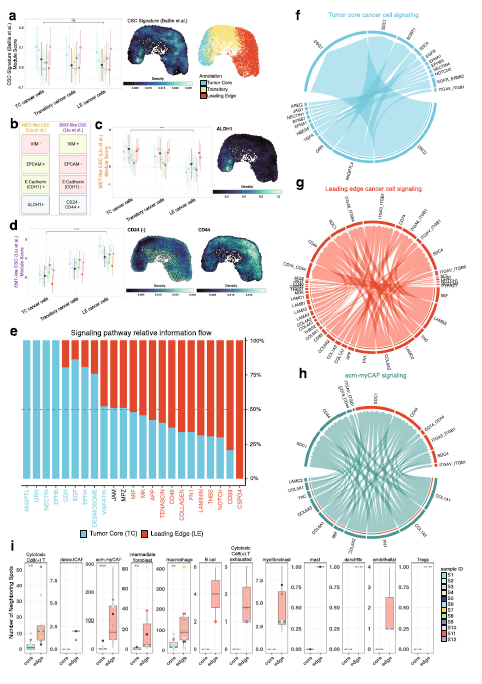 在幾個患者的同一腫瘤微環(huán)境中可能存在多個分子亞型,但亞型組成的模式并不一致。總體來說,基礎(chǔ)亞型的TC狀態(tài)最豐富,而非典型亞型的TC狀態(tài)最豐富。典型的OSCC標(biāo)記物在LE和TC之間的表達沒有顯著差異。此外,在整個UMAP投影中,CSC標(biāo)記物的表達均勻,表明CSC群體在整個OSCC腫瘤中均可見。TC和LE的獨特生物學(xué)譜可以通過獨特的癌細胞狀態(tài)的存在來解釋——保守的基因表達程序從特定的腫瘤微環(huán)境相互作用中動態(tài)表現(xiàn)出來——包括CSC和非干細胞樣惡性細胞。先前探索動態(tài)CSC狀態(tài)的文獻提出,LE中存在間充質(zhì)樣CSCs,TC中存在上皮樣CSCs。當(dāng)將與這些不同的CSC狀態(tài)相關(guān)的基因集評分到ST數(shù)據(jù)集時,結(jié)果證實了LE中間充質(zhì)樣CSC狀態(tài)存在高充質(zhì)樣CSC表達,TC中存在上皮樣CSC狀態(tài)。通過對連續(xù)組織切片的免疫熒光染色,進一步驗證了這些CSC狀態(tài)的定位,發(fā)現(xiàn)CD24標(biāo)記在TC,CD44標(biāo)記在LE。這些發(fā)現(xiàn)加強了TC和LE生態(tài)位內(nèi)的可塑性,從而促進轉(zhuǎn)錄獨特的癌細胞狀態(tài)的繁殖。