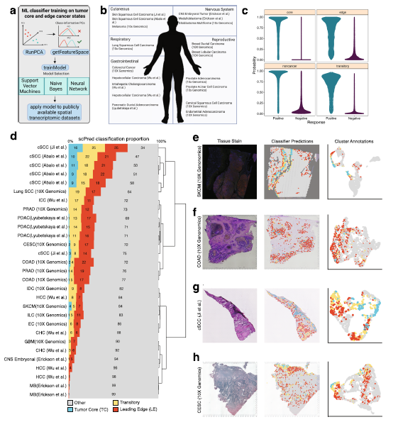 在TC點、LE點和所有其他剩余的點上訓(xùn)練了三個基于機器學(xué)習(xí)(ML)概率的預(yù)測模型,以生成一個空間-區(qū)域預(yù)測模型。將預(yù)測ML模型應(yīng)用于橫跨17種不同癌癥類型的30個公開可用的ST樣本,以描述每個樣本中的每個點為“TC”、“LE”、“短暫性”或“其他剩余點”。模型10倍交叉驗證顯示,在所有模型中LE區(qū)域的ROC最低,因為其靈敏度相對較低,為0.694。在黑色素瘤(SKCM)、結(jié)直腸腺癌(COAD)、皮膚鱗狀細胞癌(cSCC)和宮頸鱗狀細胞癌(CESC)樣本的空間分離癌細胞狀態(tài)中表現(xiàn)良好。在所有30個樣本中都發(fā)現(xiàn)了高度空間分離的LE點。模型在識別cSCC、黑色素瘤、CESC和COAD組織切片中的TC斑點方面表現(xiàn)特別好,這可能歸因于這些癌癥中存在角化程序。這些開創(chuàng)性的結(jié)果表明,LE相關(guān)的表達狀態(tài)在多種癌癥環(huán)境中是保守的,而與TC相關(guān)的表達譜更具有組織特異性。