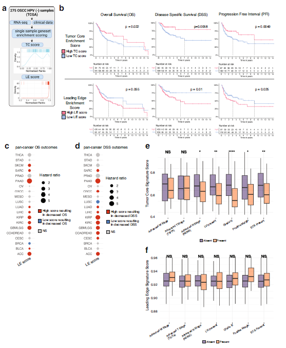 為了檢驗LE和TC的預(yù)后意義,納入了來自包含匹配生存數(shù)據(jù)的大規(guī)模轉(zhuǎn)錄組數(shù)據(jù)集(TCGA)的樣本。共選擇275例hpv陰性O(shè)SCC患者進行生存分析,根據(jù)TC和LE中差異表達基因的表達對每個樣本進行富集評分。生成Kaplan-Meier曲線,以可視化總生存(OS)、疾病特異性生存(DSS)和無進展間期(PFI)與TC和LE信號高或低表達之間的差異。