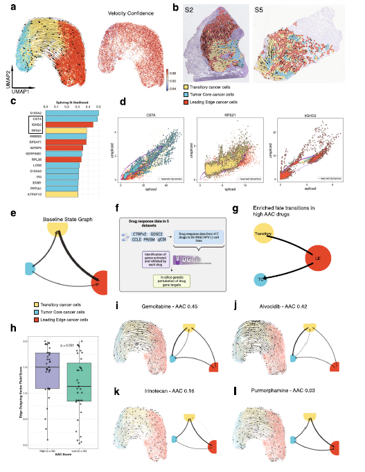 應(yīng)用了一種計算機微擾方法來識別可能預(yù)測OSCC治療成功的RNA速度的保守模式。分析了至少25個HPV陰性HNSCC細胞系中417種藥物的PharmacoDB藥物反應(yīng)數(shù)據(jù),發(fā)現(xiàn)140種藥物-基因相互作用被確定為從DGIdb70上調(diào)或下調(diào)。在高AAC藥物相對于低AAC藥物的凈流出LE轉(zhuǎn)移概率的定量測量顯著增加。在幾種無效藥物(低AAC)中發(fā)現(xiàn)了相反的表型,顯示出與基線狀態(tài)相似的過渡層次。