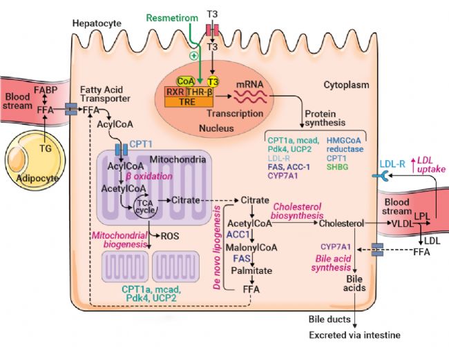 Resmetirom 可激活 THR-β 并調(diào)節(jié)幾種基因的表達(dá),這些基因可促進從外部來源 (CPT1) 吸收游離脂肪酸,以及增加從頭脂肪生成 (ACC1、FAS) 和脂肪吞噬產(chǎn)生的內(nèi)部游離脂肪酸的產(chǎn)生和吸收。線粒體生物合成 (CPT1a、mcad、PDk4、UCP2) 的增加和不健康線粒體的線粒體自噬增加了處理和燃燒增加的游離脂肪酸的能力。雖然由于 HMGCoA 還原酶的上調(diào)而產(chǎn)生膽固醇增加,但膽汁酸合成通過增加 CYP7A1 和排泄而增加,肝臟對 LDL 的吸收通過誘導(dǎo) LDL-R 而增加。因此,脂肪酸 β-氧化、線粒體生物合成、從頭脂肪生成、膽固醇和膽汁酸合成均增加,而 LDL 膽固醇水平降低。