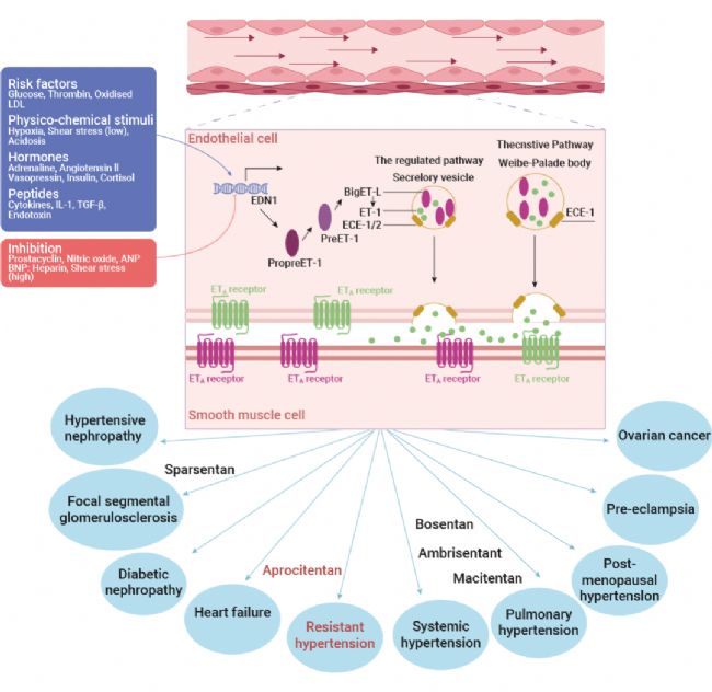 內(nèi)皮素通路在高血壓中發(fā)揮著重要的作用,內(nèi)皮素-1 (ET-1) 是人體心血管系統(tǒng)中內(nèi)皮素 (ET) 家族的主要同工型。它由血管內(nèi)皮細(xì)胞大量產(chǎn)生,用于維持血管張力和對不同刺激作出反應(yīng)。在血管中,ET-1 通過兩種受體起作用: ETA 受體和 ETB (ETB1 + ETB2) 受體,它們位于血管平滑肌細(xì)胞和內(nèi)皮細(xì)胞上,通過誘導(dǎo)血管收縮或血管舒張來調(diào)節(jié)血壓。Aprocitentan 作為一種內(nèi)皮素受體拮抗劑,可抑制蛋白質(zhì)內(nèi)皮素-1 與內(nèi)皮素 A 和內(nèi)皮素 B 受體結(jié)合從而達(dá)到治療目的。適應(yīng)癥:6 歲及以上患者的杜氏肌營養(yǎng)不良癥 (DMD)