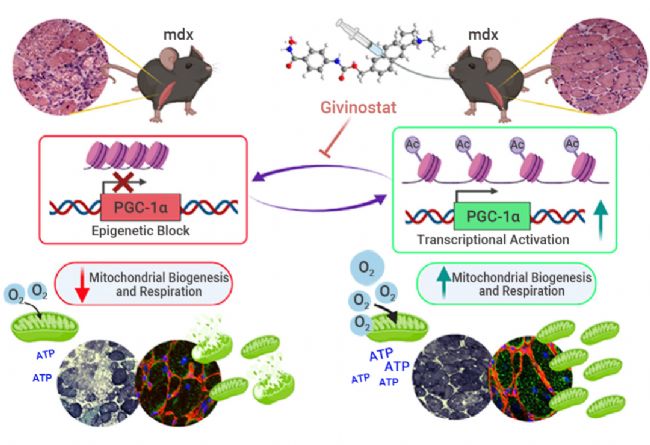 線粒體功能障礙是 DMD 最早的缺陷之一,線粒體生物合成障礙逐漸加重,與過氧化物酶體增殖激活受體-γ 輔激活因子 1α (PGC-1α) 啟動子的去乙;黾佑嘘P(guān)。Givinostat 可抑制此類組蛋白去乙酰化,從而積極改變 PGC-1α 啟動子的表觀遺傳特征,維持線粒體生物合成和氧化纖維類型轉(zhuǎn)換。