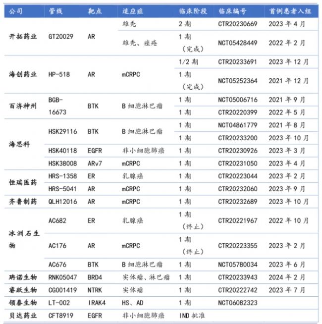 盡管PROTAC是一種暫無(wú)指導(dǎo)原則的新興小分子藥物,但它“事件驅(qū)動(dòng)模式”的功效性促使藥物研發(fā)領(lǐng)頭軍們對(duì)其展開(kāi)了孜孜不倦的研究。目前國(guó)內(nèi)部分藥企對(duì)PROTAC分子藥物的開(kāi)發(fā)已接近國(guó)際水平并達(dá)到了臨床階段。