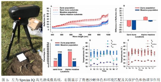 該研究運用北京易科泰生態(tài)技術(shù)公司提供的Specim IQ便攜式高光譜成像技術(shù)方案,采集分析了高原蜥蜴(Phrynocephalus putjatai)在不同背景環(huán)境條件下的400-1000nm高光譜成像數(shù)據(jù),并對其體色變化進行了分析。結(jié)果發(fā)現(xiàn),青海湖邊溫暖沙丘和寒冷草甸的貴德沙蜥在體表光譜反射方面呈現(xiàn)出明顯差異:溫暖沙丘種群的淺色貴德沙蜥具有較高的光譜反射率,而寒冷草甸種群的深色貴德沙蜥則反射率較低。