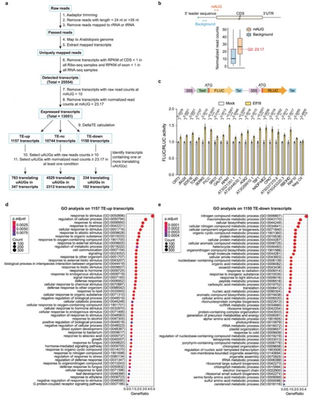 研究首先對正常處理和elf18誘導免疫處理的擬南芥樣本進行RNA-seq和Ribo-seq測序。綜合RNA-seq數據和Ribo-seq數據,對檢測到的25,554個可表達的轉錄物進行分析,篩選得到13,051個mAUGs上游5’UTR含有uAUGs的可表達轉錄物(含有uAUGs)。對比正常處理和elf18處理樣本的翻譯效率(TE),將這13,051個轉錄物分為TE-up、TE-nc和TE-down三組,通過GO分析發現了TE-up組基因與相應環境脅迫等生物過程有關,而TE-down組基因主要是與生長相關代謝過程有關(Extended Data Fig.2)。