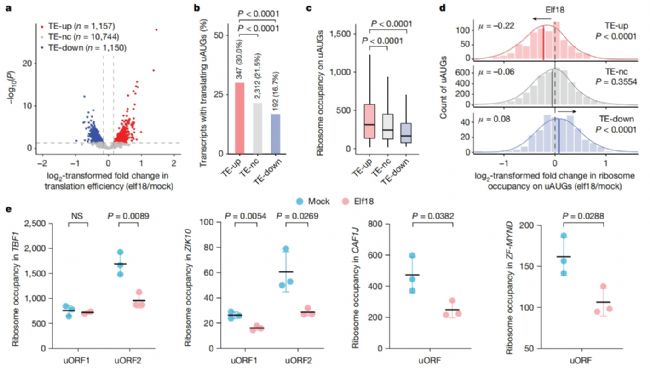 為了鑒定uAUGs在翻譯調控中的作用,研究又從這13,051個轉錄物中篩選出翻譯型uAUGs,發現翻譯型uAUGs在TE-up組中顯著富集,表明了uAUGs在調節免疫相關翻譯中具有普遍作用(Fig. 1b)。研究還對比了正常處理和elf18誘導免疫處理下,TE-up組轉錄物中的翻譯型uAUGs特征,發現在正常處理下翻譯型uAUGs的翻譯起始率較高(核糖體占有率),而elf18處理后這種類型的uAUGs翻譯起始率顯著降低(Fig. 1e)。由于uAUGs起始的翻譯通常會抑制下游mORFs翻譯,所以在elf18處理下uAUGs起始的翻譯的減少也解除了對下游mORFs翻譯的抑制作用。