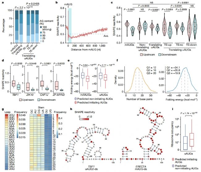 為了直接觀察結構模式與AUGs的翻譯起始的關系,研究開發了基于一級序列和結構數據的TISnet模型,來預測翻譯的起始位點。經過mAUGs和internal AUGs數據訓練的模型,可以預測到翻譯型uAUGs和非翻譯型uAUGs之間存在顯著差異(Extended Data Fig. 5d)。模型預測出的起始型uAUGs下游序列比非起始型具有更高的負折疊自由能(易形成二級結構)(Fig. 2e)和更高的核糖體占有率(Fig. 2i),表明TISnet模型也可以準確預測翻譯型uAUGs。以上研究表明了在正常情況下,AUGs下游RNA二級結構可以促進該位置的翻譯起始,與上游RNA二級結構抑制翻譯起始相反。