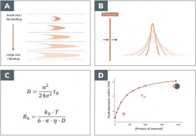 圖1 FIDA基本原理。A. 樣品在毛細管中分散分布示意,橫截面輪廓形狀取決于帶有熒光的分子大小或其與配體形成的復合物大小;B. 信號峰:樣品流經檢測器時產生;C-D. 擴散系數D和流體力學半徑Rh計算,擬合可得到分子互作親和力KD值等。
