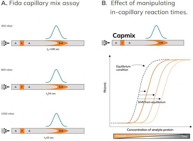FIDA,(Flow Induced Dispersion Analysis) 即流體誘導分散分析,基于毛細管中層流運動的分析方法,當樣品通過毛細管時,由于毛細管中心和毛細管壁之間速度不同,毛細管中心速度快,毛細管邊緣速度慢,樣品流動呈拋物線剖面。不同的拋物線剖面(圖1.A)決定了信號曲線的形狀(圖1.B),結合斯托克愛因斯坦方程和泰勒分散公式,以此實現對分子粒徑(size,流體力學半徑Rh)“第一性原理(first principle)”測量。FIDA的流體動力學半徑測量廣泛適用于生物分子穩定性、構象變化、相互作用等方面的研究。