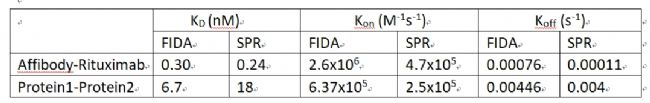 FIDA和SPR蛋白-蛋白互作動力學數據比較