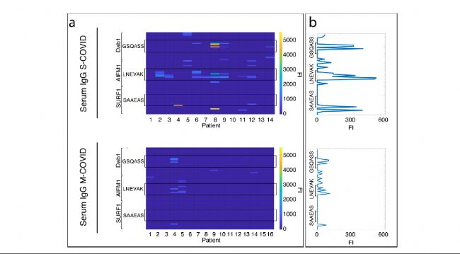 圖 2. 嚴重與輕癥COVID-19 患者血清IgG對 DAB1、AIFM1 和 SURF1結合存在顯著差異。 a) 上方熱圖顯示血清 IgG 與三種神經元自身抗原的表位結合是COVID-19嚴重患者 (S-COVID) 的特征,下方熱圖顯示大多數COVID-19輕度患者(M-COVID)不存在與相同自身抗原結合的IgG 。 b) a 圖中熱圖呈現的兩組患者免疫熒光強度值進行平均,并根據 DAB1、AIFM1 和 SURF1 的預測表位進行繪圖,以便在嚴重和輕度患者之間進行直接比較。 (FI=熒光強度)。