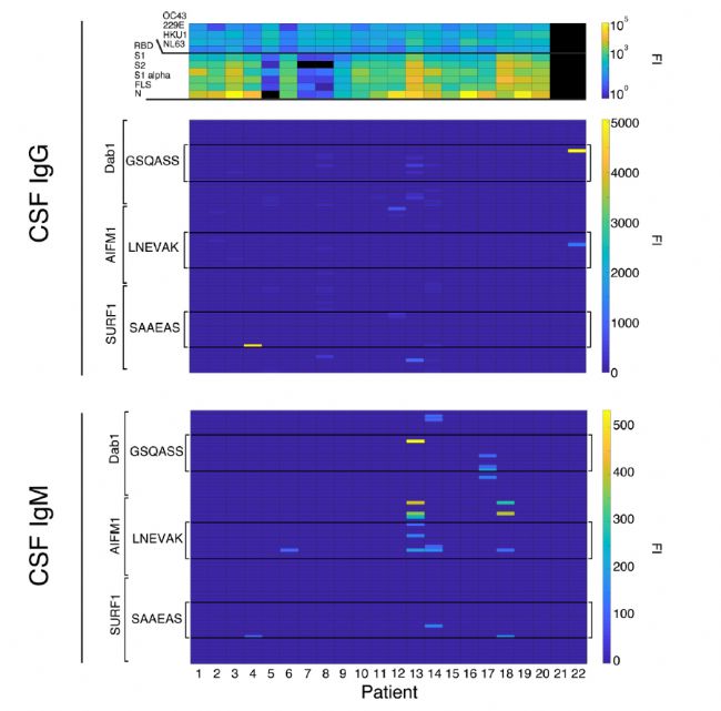 圖 3. 22 名嚴重感染 COVID-19 患者腦脊液針對 DAB1、AIFM1 和 SURF1 的自身抗體。上圖顯示針對不同患者腦脊液IgG 與病毒蛋白的反應,中圖顯示腦脊液IgG 與所預測人類多肽序列結合,下圖顯示了腦脊液IgM結合相同序列的情況。 (FI=熒光強度)。