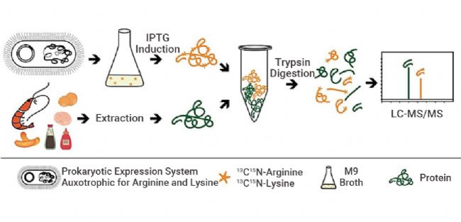 最近中國農業大學的 Wu Yige 等人,用同位素標記的 L-Arginine-13C6,15N4 和 L-Lysine-13C6,15N2,巧妙的結合 SILAC 技術,培養了同位素標記的蝦過敏原原肌球蛋白 (TM-1),以其作為內標,運用 UPLC-MS/MS 準確定量檢測了復雜食品基質中的蝦過敏原肌球蛋白含量,定量限為 1-10 μg/g[2]。