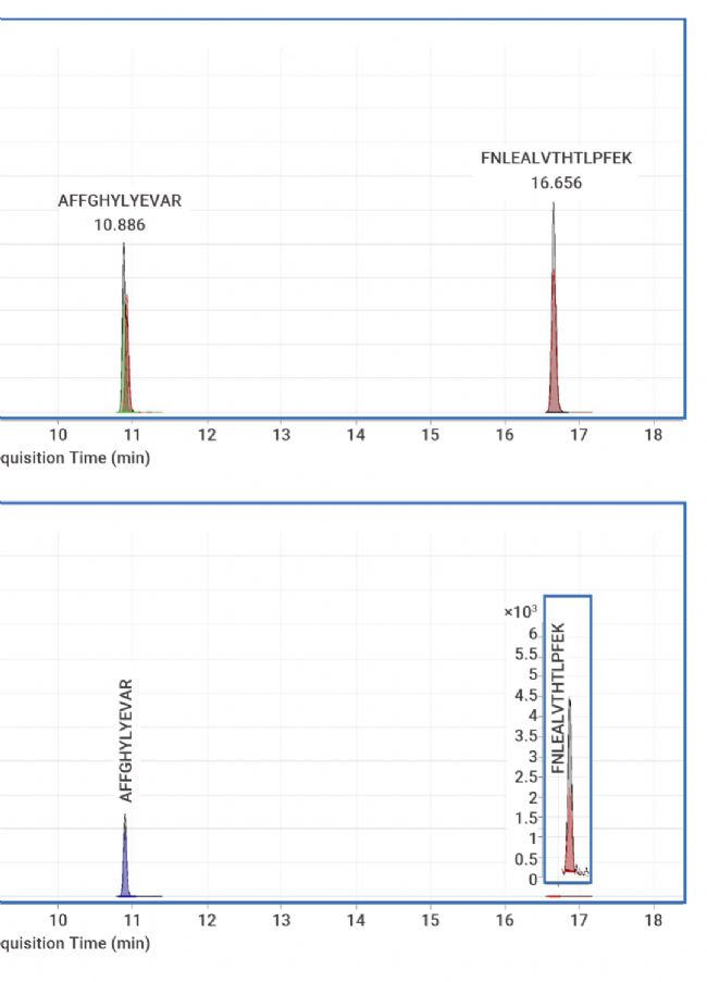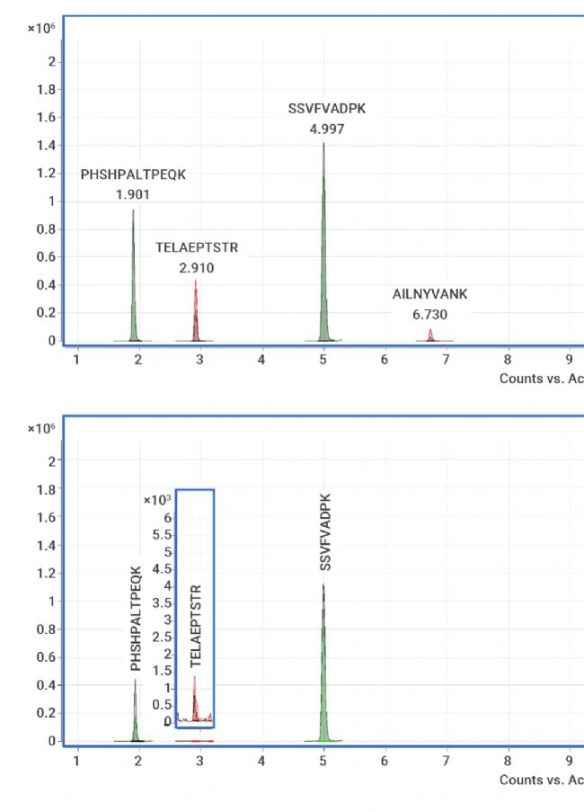 Stachniuk A等人使用兩種兔骨骼肌特異性肽 (SSVFVADPK和PHSHPALTPEQK)、三種兔肝組織特異性肽 (FNLEALVTHTLPFEK、AILNYVANK和TELAEPTSTR) 以及一種同時特異于兔內臟和骨骼肌組織的肽(AFFGHYLYEVAR)作為特異性同位素標記的多肽[3]。