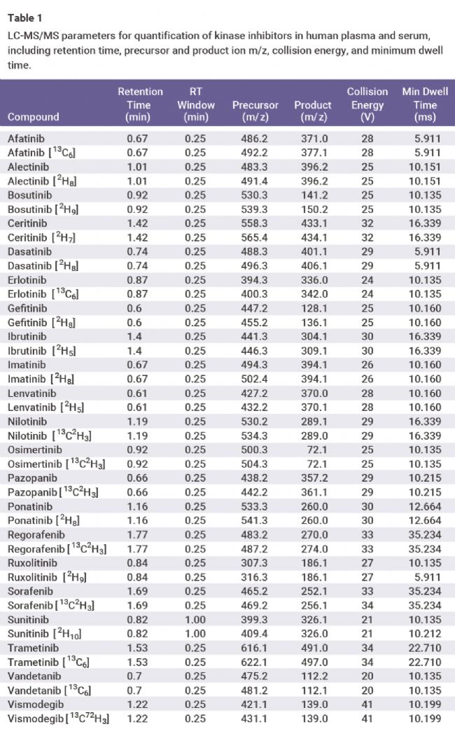圖 5. 用于定量人血漿和血清中激酶抑制劑的 LC-MS/MS 參數[4]。