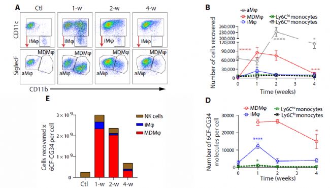 圖2. 流式細胞術鑒定驅動CMKLR1靶向肽攝取的細胞。(A)肺泡巨噬細胞、間質巨噬細胞和MDMφ的鑒定。(B)單核細胞和巨噬細胞亞群絕對數量的動力學。(D)單核細胞和巨噬細胞群體對6CF- CG34特異性攝取的定量檢測。(E)給藥后攝取6CF- CG34的細胞亞群占比。