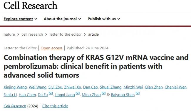 2024年6月24日,上海交通大學醫學院附屬瑞金醫院胰腺疾病診療中心沈柏用教授、上海信譜生物醫藥科技有限公司趙明、瑞金醫院胰腺疾病研究所蔣玲曦研究員、符達研究員等以共同通訊作者身份在國際醫學頂刊Cell Research(IF 28.1,Q1)在線發表了mRNA腫瘤疫苗研究新進展: Combination therapy of KRAS G12V mRNA vaccine and pembrolizumab: clinical benefit in patients with advanced solid tumors,該研究報道了針對KRAS G12V單靶點的mRNA腫瘤疫苗在實體瘤中的治療效果。