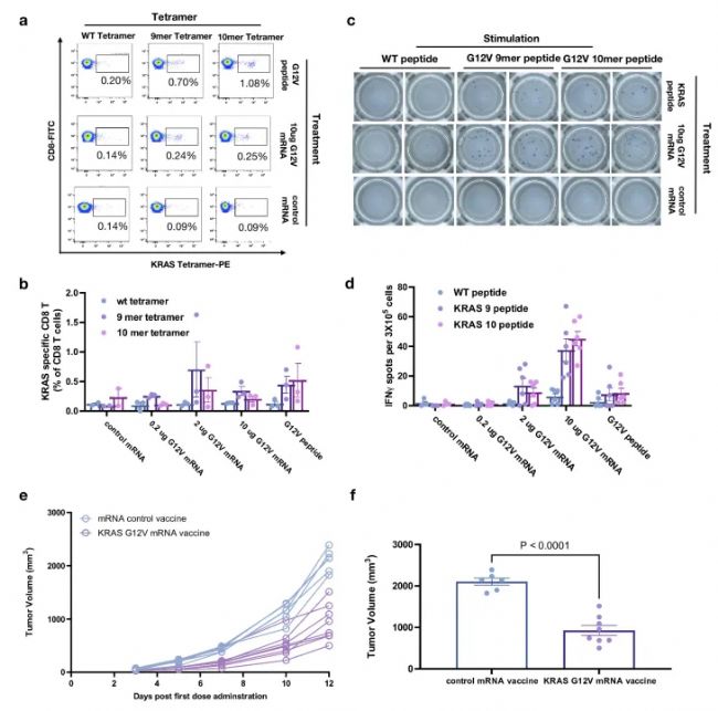 KRAS與高致命性癌癥有關,如胰腺導管腺癌(PDAC)和非小細胞肺癌(NSCLC)。已知在多個肽-MHC組合中,KRAS G12V-HLA-A*11:01有最強的親和力,誘導T細胞反應的成功率最高,對腫瘤細胞的殺傷作用最明顯。研究者使用質譜法驗證了KRAS G12V新抗原的表達和呈遞及其與HLA-A*11:01的結合(圖S1)。通過四聚體染色實驗、ELISPOT實驗,以及用KRAS G12V mRNA疫苗處理HLA-A*11:01小鼠,證明了KRAS G12V mRNA疫苗可以誘導G12V特異性T細胞在體內的擴增(圖S2 a,b)和激活(圖S2 c,d),隨后減緩了攜帶有KRAS G12V腫瘤的生長(圖S2 e,f)。這些臨床前研究結果證實了KRAS G12V mRNA疫苗可以誘導抗原特異性的細胞毒性T淋巴細胞(CTL)。