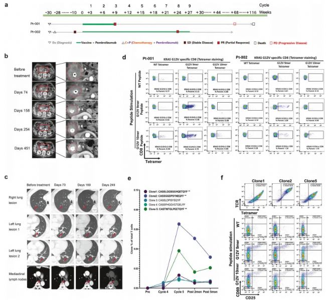 圖1 晚期實體瘤中靶向KRAS G12 V突變(HLA-A*11:01限制性)mRNA疫苗的臨床獲益及特異性T細胞檢測。