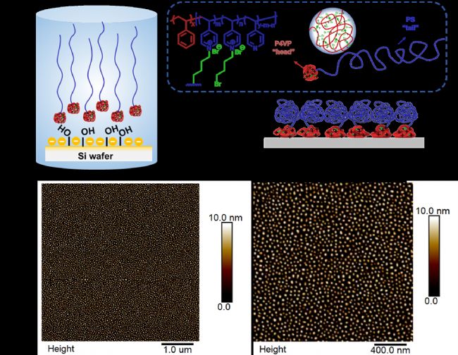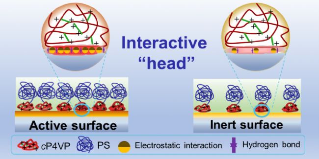 通過聚苯乙烯-b-聚(4-乙烯基吡啶)(PS-b-P4VP)嵌段的P4VP鏈內交聯制備得到蝌蚪狀單鏈粒子(TSCP),可在硅片表面實現均勻接枝(圖1)。在接枝過程中,通過“頭部”與表面之間的多種相互作用的協同作用,“頭部”可以牢固地粘附在活性表面和惰性表面上;即使是接枝到惰性表面上,通過多種弱相互作用的集合和協同作用,TSCPs 仍能實現穩定的接枝(圖2)。