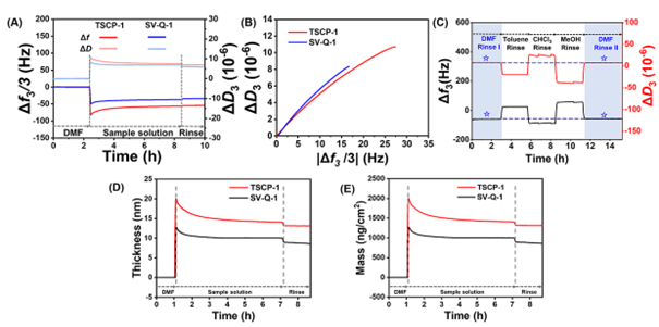 圖3 (A) TSCP-1和SV-Q-1的QCM-D吸附動力學,接枝濃度均為為0.2 mg/mL;(B) TSCP-1和SV-Q-1接枝過程中的ΔD vsΔf圖;(C) QCM-D監測TSCP-1聚合物刷的溶劑穩定性;TSCP-1和SV-Q-1在DMF中吸附的QCM-D厚度(D)和水合質量變化(E)。