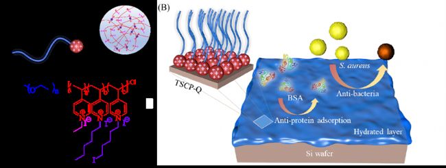 圖4 (A) TSCP-Q的化學結構;(B) TSCP-Q接枝后的硅片表面具有良好的“生物防污”功能。