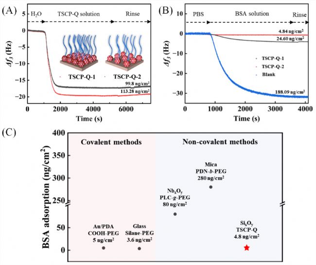 圖5 (A) TSCP-Q在在氧化硅芯片表面的吸附動力學曲線;(B) BSA在TSCP-Q刷表面的吸附動力學曲線;(C)TSCP-Q刷抗蛋白粘附的性能比較圖。