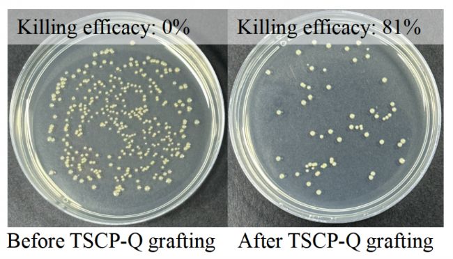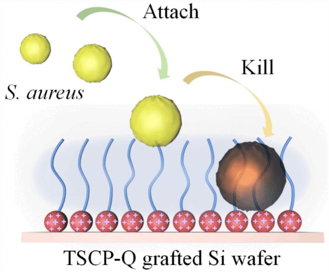 利用(S. aureus)對TSCP-Q接枝的硅片表面進行抗菌評價。由于TSCP-Q的“尾部”PEG能夠動態穿透細胞膜,并促進細菌與TSCP-Q“頭部”的高密度季銨鹽接觸,所以TSCP-Q修飾的硅片對S. aureus體現出良好的抗菌性(81%)(圖7, 8)。