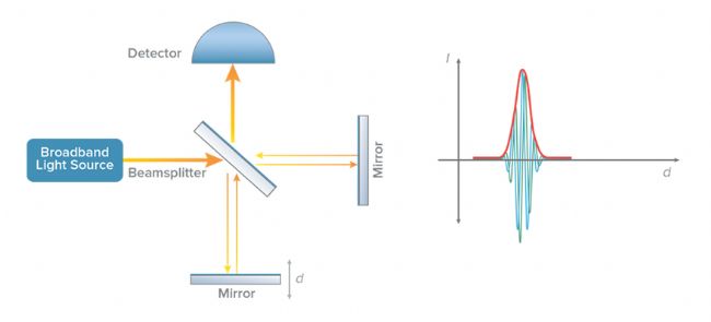 在低相干干涉儀中,使用具有寬光譜帶寬的光源進(jìn)行照明。光源發(fā)出的光被分束器分成兩條路徑,稱為參考臂和樣品臂。來自每條臂的光被反射并在檢測器處結(jié)合。只有當(dāng)參考臂和樣品臂的光程幾乎相等時(shí),檢測器上才會(huì)出現(xiàn)干涉效應(yīng)。因此,干涉現(xiàn)象的出現(xiàn)可以被用來進(jìn)行光程的相對測量。