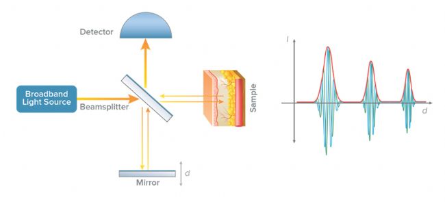 光學(xué)相干斷層掃描就是將樣品臂中的鏡子替換為待成像的樣品。然后對參考臂進(jìn)行掃描,并在檢測器上記錄得到的光強(qiáng)度。當(dāng)鏡子幾乎與樣品中的某個(gè)反射結(jié)構(gòu)等距時(shí),會(huì)出現(xiàn)一定的干涉圖案,從而獲得樣品對應(yīng)位置的結(jié)構(gòu)信息。顯然在參考鏡移動(dòng)的過程中,兩次干涉發(fā)生對應(yīng)的參考鏡位置之間的距離對應(yīng)于測量光路中樣品兩個(gè)反射結(jié)構(gòu)之間的光學(xué)距離。當(dāng)光束穿過樣品時(shí),不同的位置的獨(dú)特結(jié)構(gòu)會(huì)通過上述低相干干涉記錄的反射量被記錄下來,從而得到測量樣品的散射信號和深度之間的函數(shù)關(guān)系。