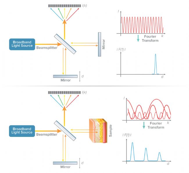 傅里葉域OCT(FD-OCT)提供了一種更高效的方法來實(shí)現(xiàn)上述低相干干涉。傅里葉域OCT(FD-OCT)并不是像上邊提到方法那樣在參考鏡的不同位置記錄強(qiáng)度,而是將強(qiáng)度記錄為光的波長(或頻率=光速/波長)的函數(shù)。不同頻率的光強(qiáng)度變化率反映樣品中不同反射層的位置信息。可以證明,光譜干涉數(shù)據(jù)的傅里葉變換提供的信息相當(dāng)于移動(dòng)參考鏡所獲得的信息。