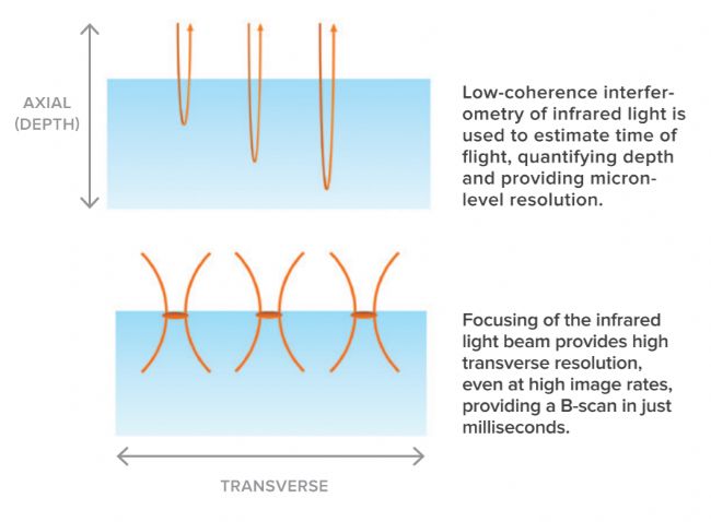 OCT依賴于樣品不同區(qū)域的背向散射光來生成3D圖像。它使用不同的定位技術(shù)來獲取軸向(沿光束方向或進(jìn)入樣品的z軸)和橫向(垂直于光束的平面或樣品的x-y軸)信息。軸向信息是通過估計(jì)從樣品中的結(jié)構(gòu)或?qū)臃瓷涞墓獾臅r(shí)間延遲來獲得的。這種技術(shù)類似于生成超聲波圖像的技術(shù),但使用的是光而不是聲音。由于光速極快,直接測量反向散射光的時(shí)間延遲并不容易。因此,OCT系統(tǒng)使用低相干干涉技術(shù)間接測量時(shí)間延遲。
