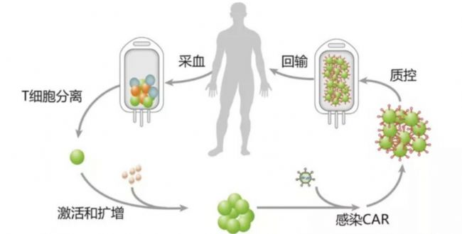 (5) 回輸CAR-T細胞:將擴增完成的CAR-T細胞回輸至病人體內,開始進行腫瘤細胞免疫治療;