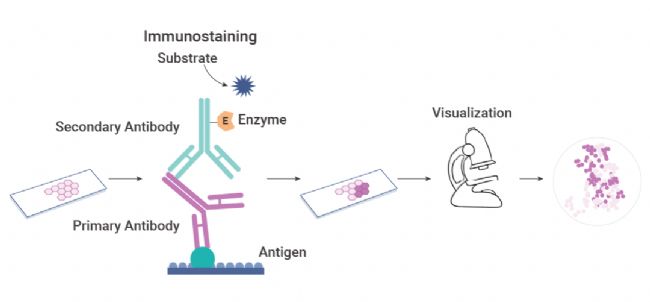 1)加入酶的底物 (如 HRP 的底物為 DAB,AP 的底物為 BCIP/NBT)。2)底物在酶的作用下發生化學反應,形成有色沉淀物,通常呈現棕色 (對于HRP-DAB 系統) 或藍色 (對于 AP-BCIP/NBT 系統)。